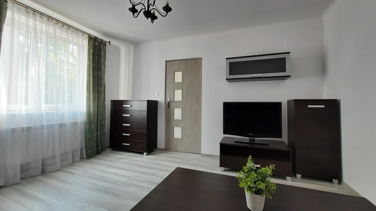 Mieszkanie składa się z wygodnego salonu w pełni umeblowanego, funkcjonalnej kuchni oraz łazienki. W salonie znajduje się telewizor oraz meble wypoczynkowe, a także pojemna szafa zapewniająca wystarczająco dużo miejsca na przechowywanie rzeczy.