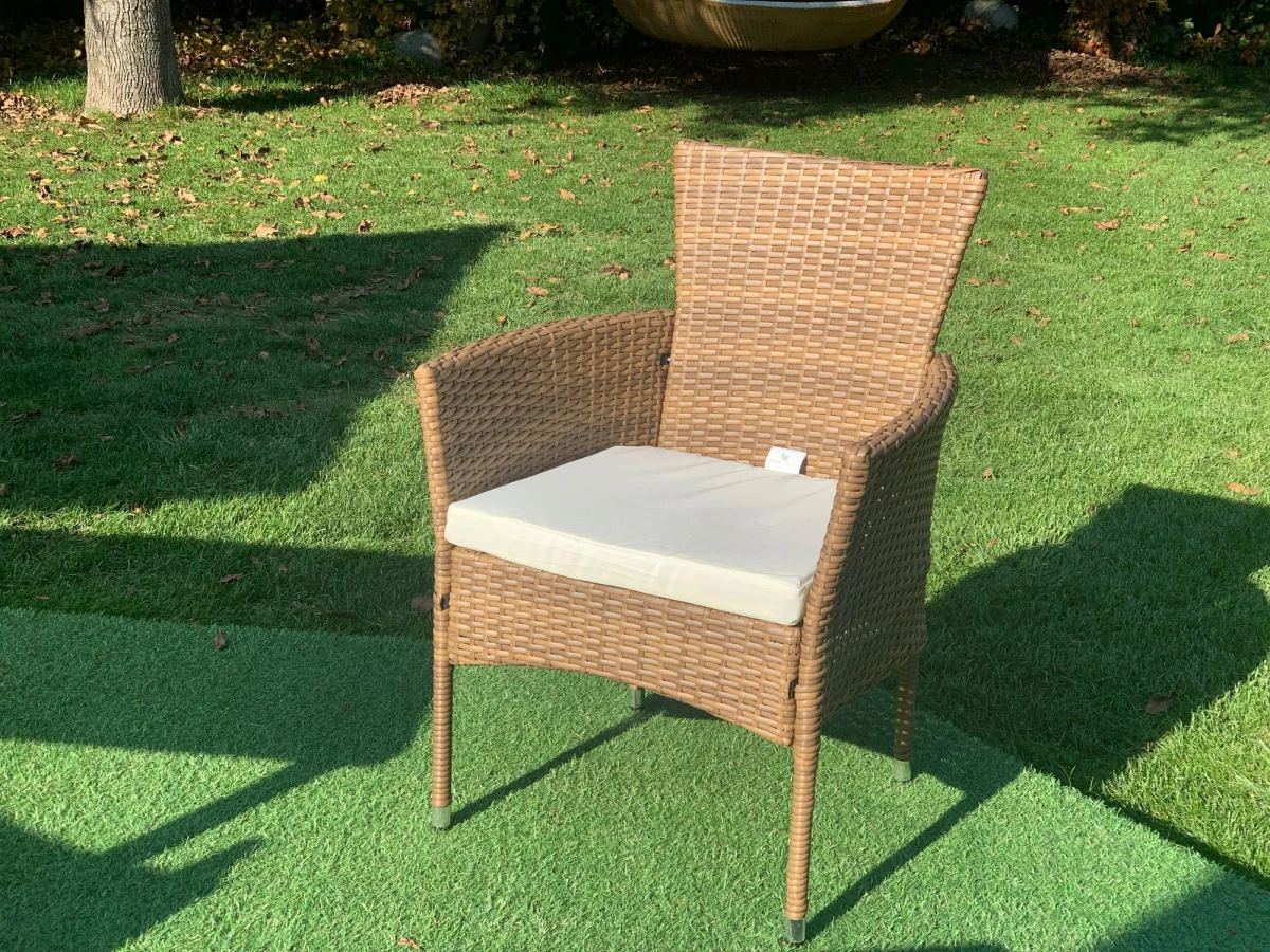 materiał zewnętrzny: technorattan w kolorze beżowoszarym (tworzywo sztuczne imitujące naturalny rattan, łatwy w utrzymaniu czystości)