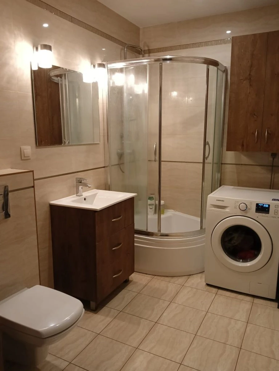 Składa się ono z trzech pokoi: dwóch oddzielnych sypialni oraz pokoju dziennego połączonego z aneksem kuchennym. W mieszkaniu znajduje się również łazienka z prysznicem, toaletą i pralką, oraz przedpokój. Kuchnia wyposażona jest w meble w zabudowie oraz sprzęt AGD, takie jak kuchenka gazowa, piekarnik, zmywarka, lodówka z zamrażarką i mikrofalówka.