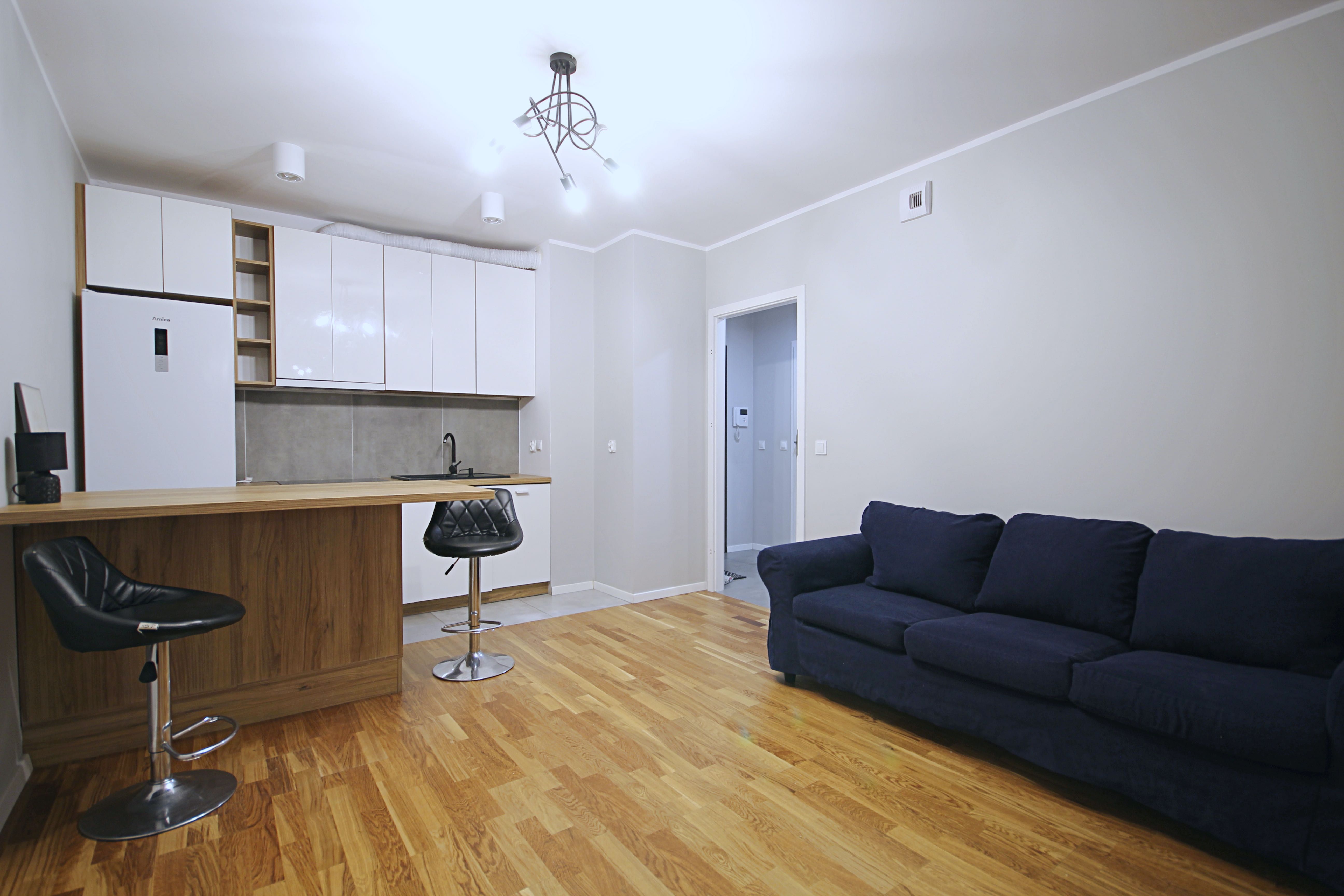- Salon z sofą, wyposażona kuchnia w zabudowie