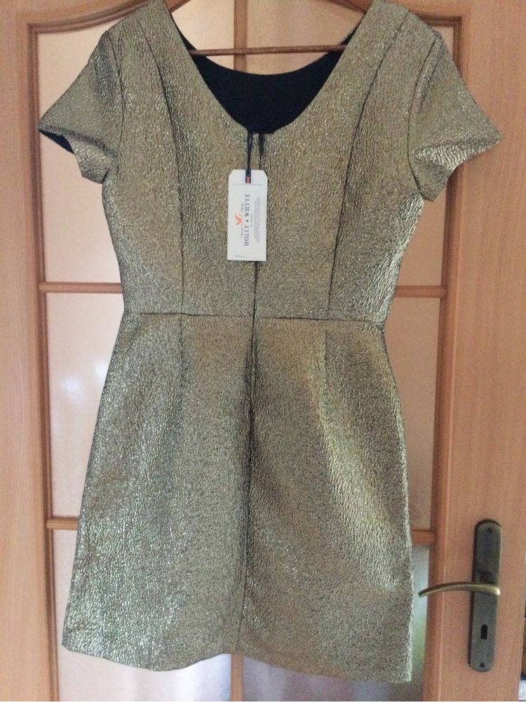 Sukienka ze złotą nitką,z podszewką.Nowa z metką. Rozmiar 38 EUR,12. Bardzo ładny krój. Z tyłu długi suwak,materiał miękki i ładnie się układa. Bardzo ładna na Sylwestra,Wigilię itp.