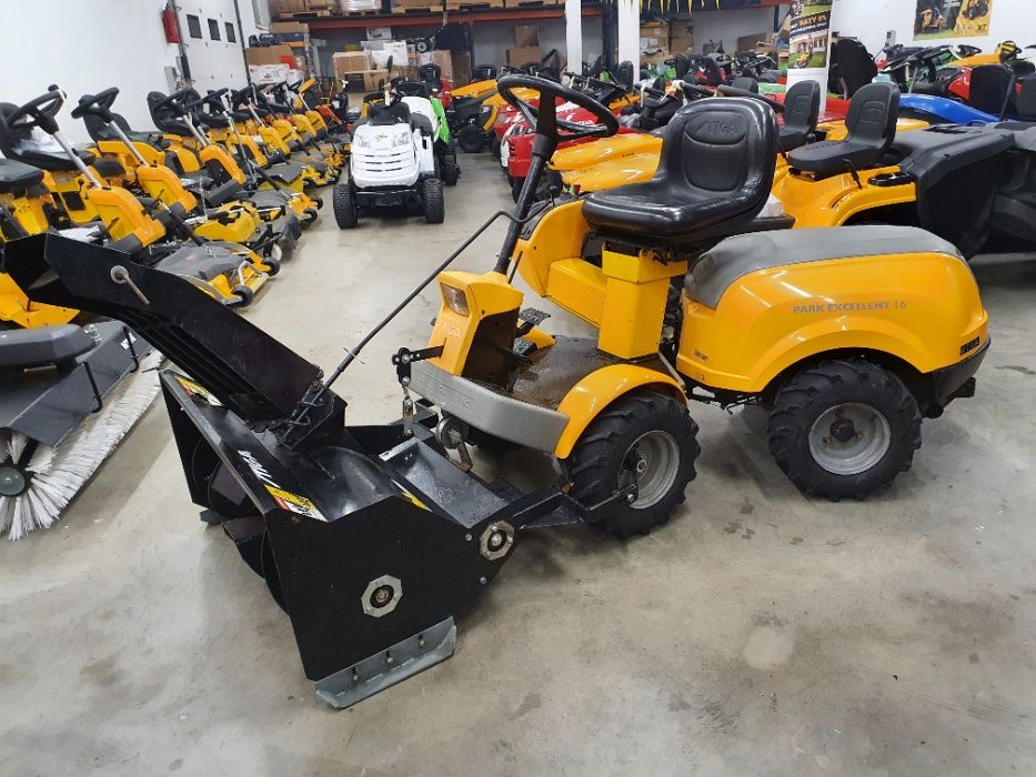 Używany traktor Stiga Park Excellent 16 na nowych oponach jodełkowych z odśnieżarką dwustopniową Stiga.
