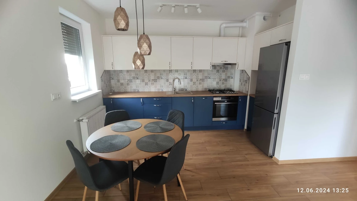 W mieszkaniu znajduje się aneks kuchenny o powierzchni 6,9 m2, wyposażony we wszystkie niezbędne urządzenia AGD: lodówko-zamrażarka, kuchenka gazowa, pochłaniacz, piekarnik elektryczny oraz zmywarka. Do dyspozycji mieszkańców jest również stół jadalniany z czterema krzesłami, co zapewnia wygodne miejsce do spożywania posiłków.