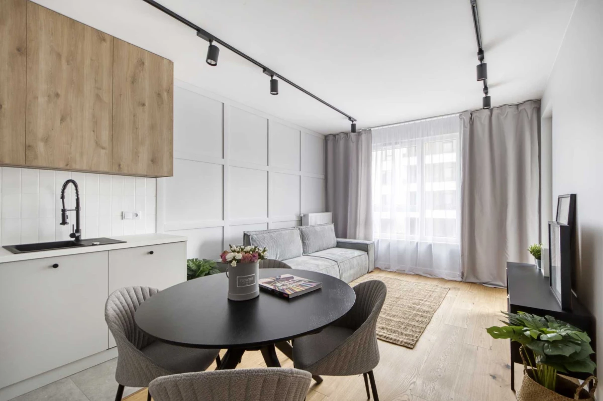 Mieszkanie zostało urządzone z dbałością o najmniejsze szczegóły, prezentując najwyższy poziom wykończenia. Kuchnia została kompletnie wyposażona w sprzęty AGD, takie jak zmywarka, lodówka, piekarnik, płyta indukcyjna oraz pralka. Całość została zaaranżowana przez profesjonalnego projektanta, wykorzystując najwyższej jakości materiały. Meble wykonane na zamówienie zapewniają dużą ilość miejsca na przechowywanie.