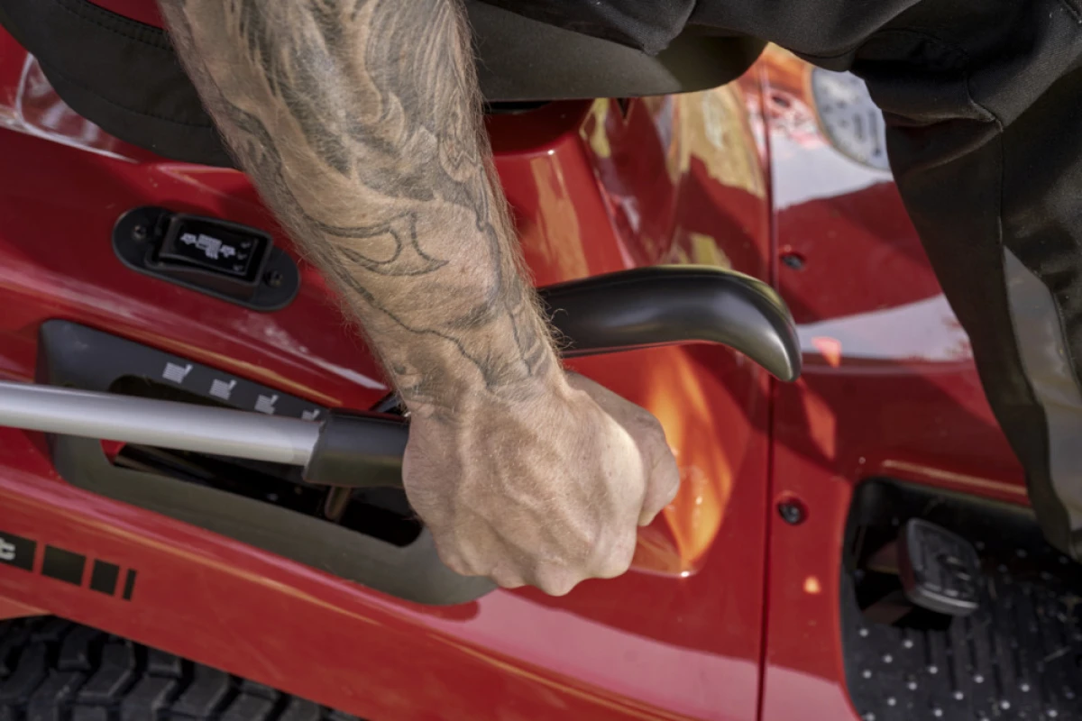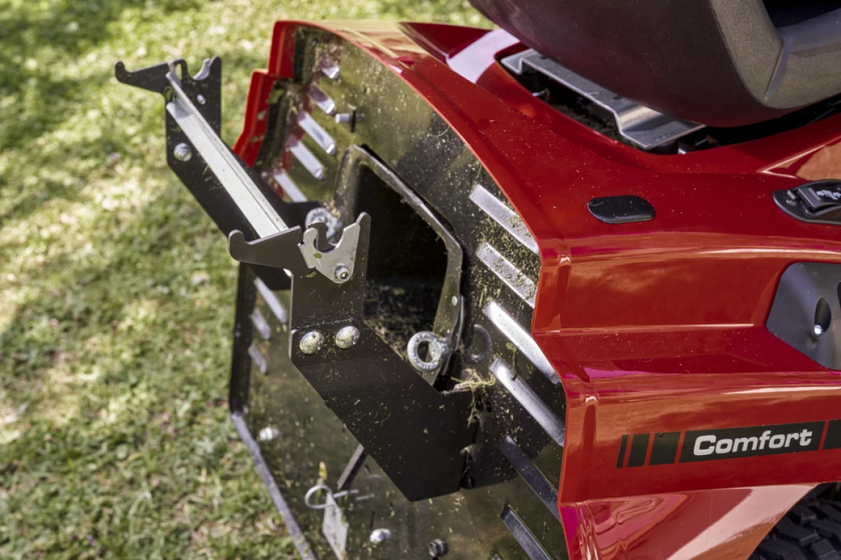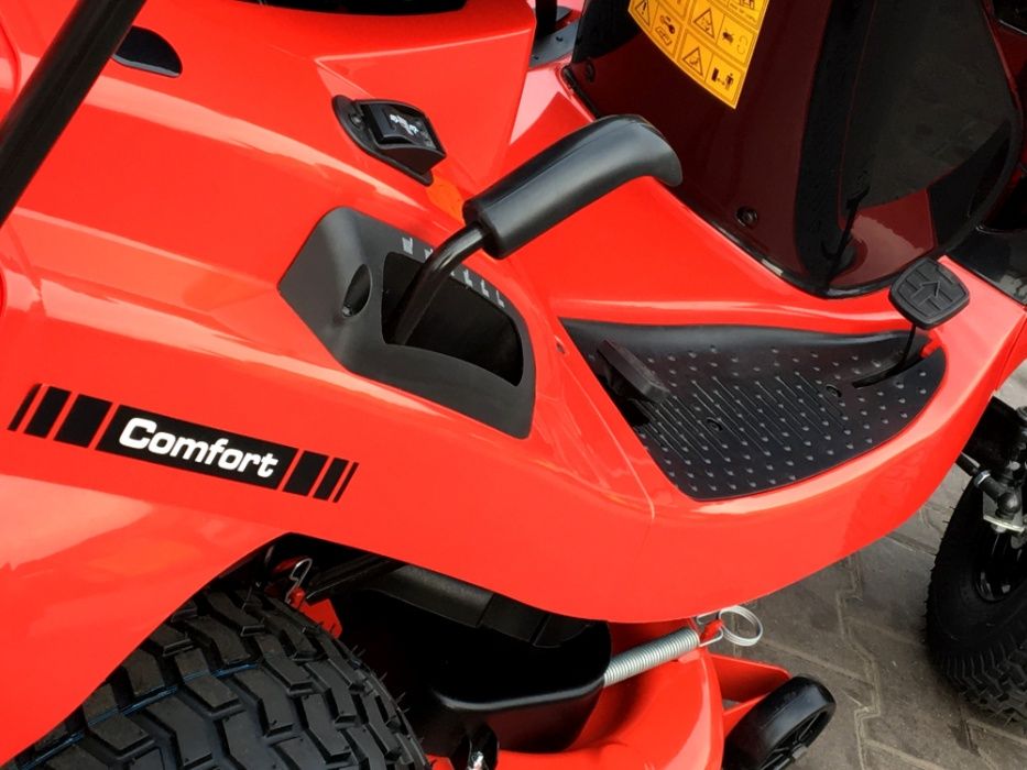 Potężna rama traktora, łożyska w kołach, końcówki drążków kierowniczych, szybki demontaż agregatu koszącego, czynią ten traktor wyjątkowym.