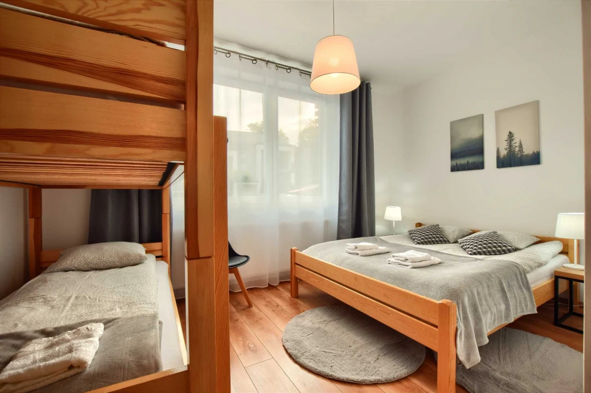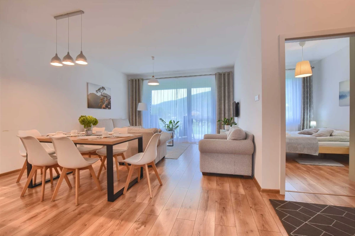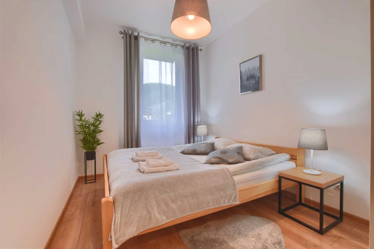 Posiadam do wynajęcia dwa nowo wybudowane apartamenty o powierzchni 74m2 oddane do użytku w styczniu 2020, w samym sercu malowniczej górskiej miejscowości Szczyrk. Każdy z lokali przeznaczony jest maksymalnie dla 8 osób. W apartamentach znajdują się dwie duże sypialnie z łóżkiem małżeńskim, dodatkowo w jednej sypialni umieszczono łóżko piętrowe, które jest uwielbiane przez dzieci. Do dyspozycji gości jest kompleksowo wyposażony aneks kuchenny oraz salon z rozkładaną sofą.