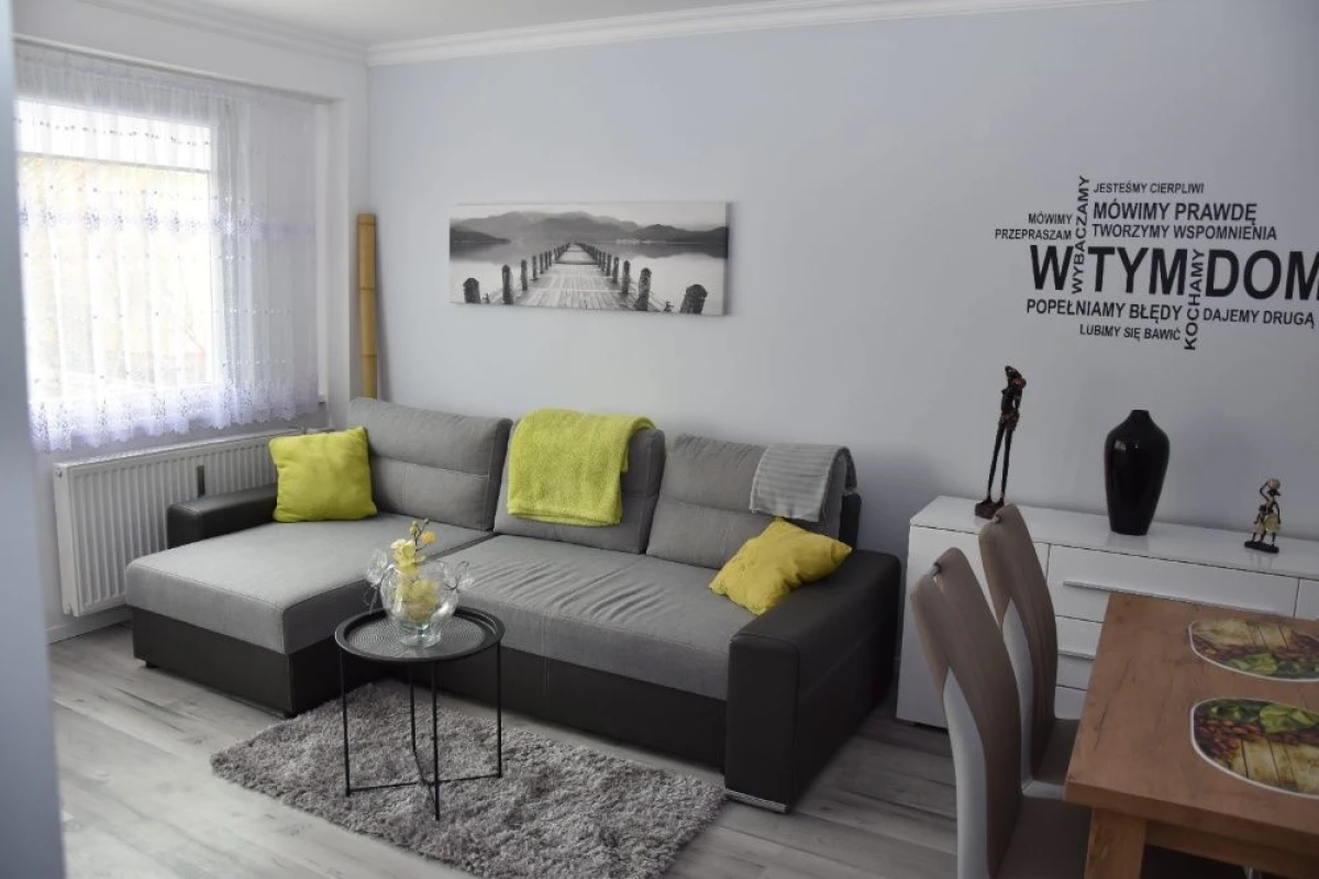 Mieszkanie jest bardzo jasne i funkcjonalne, oraz w pełni umeblowane. Kuchnia wyposażona jest w zabudowę kuchenną oraz sprzęt AGD (płyta gazowa, piekarnik, okap, lodówka) oraz pełne wyposażenie. W łazience znajdują się sanitariaty oraz prysznic, a także pralka.