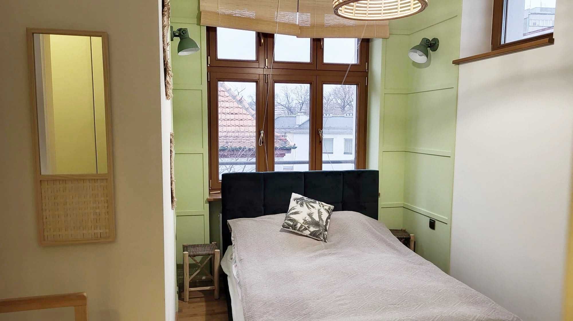 - klimatyczna sypialnia z wygodnym łóżkiem i dużą szafą