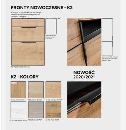 Fronty nowoczesne K2 KAMMONO BLACK gr. 18 mm wykonane z płyty laminowanej w dekorach naturalnych: sosna andersen, buk jasny, dąb arlington, dąb złoty, dąb szary, dąb hikora. Krawędzie płyty oklejone są czarnym 3 mm obrzeżem ABS, w którym zintegrowany jest czarny uchwyt aluminiowy.