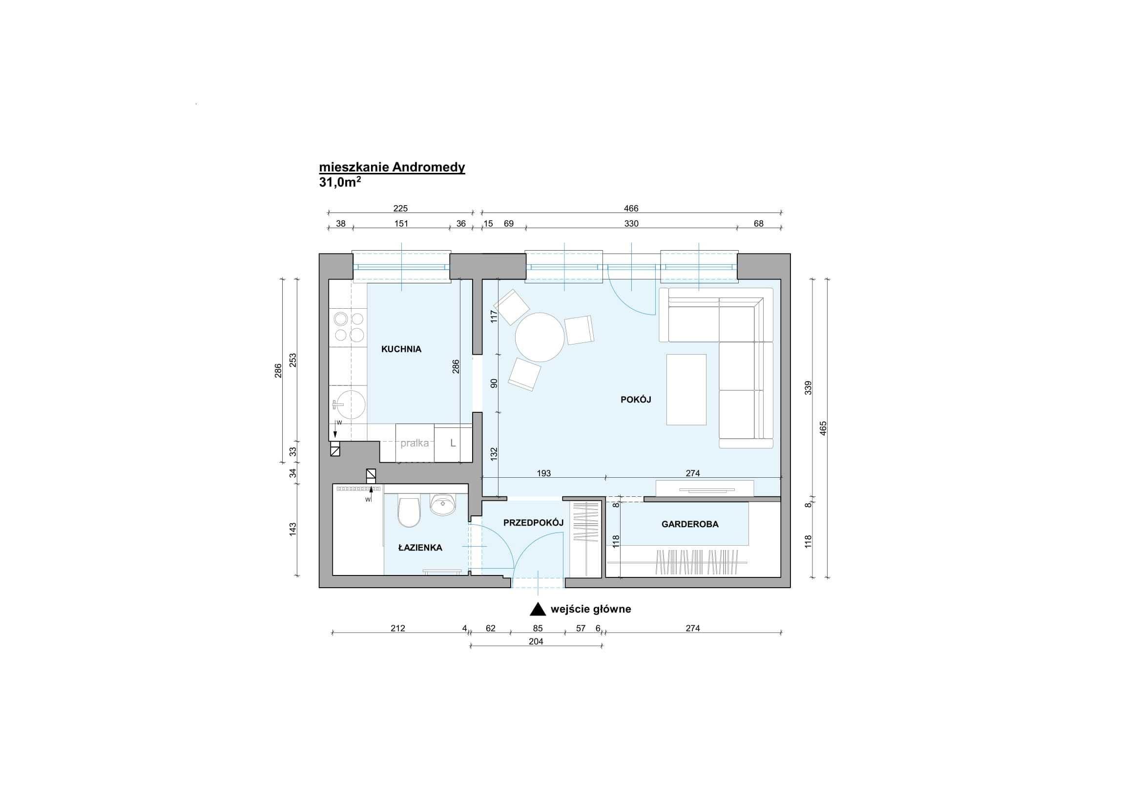Mieszkanie składa się z pokoju, korytarza, kuchni, łazienki oraz garderoby, która może służyć za schowek na deskę do prasowania, odkurzacz, rolki, karimaty i inne graty.
