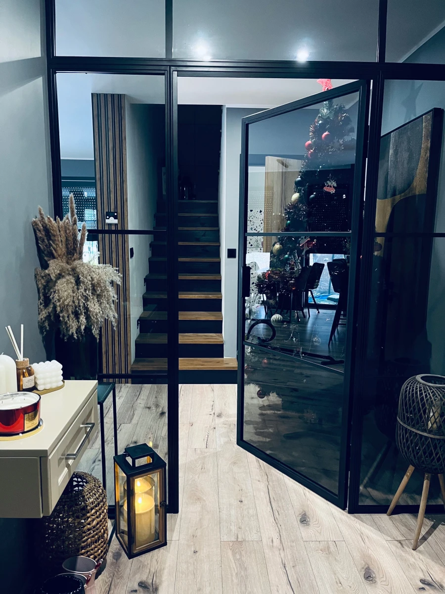 Wnętrze domu urządzone jest w nowoczesnym stylu, a na parterze znajduje się otwarty salon połączony z kuchnią, z wyjściem na taras, łazienka, wiatrołap z dostępem do garażu i kotłowni. Na piętrze znajdują się trzy sypialnie, w tym jedna z bezpośrednim dostępem do garderoby i mniejszej łazienki, oraz większa łazienka dla pozostałych mieszkańców. Dodatkowo, na poddaszu znajduje się strych, który może być wykorzystany do przechowywania lub adaptacji na dodatkową przestrzeń mieszkalną.