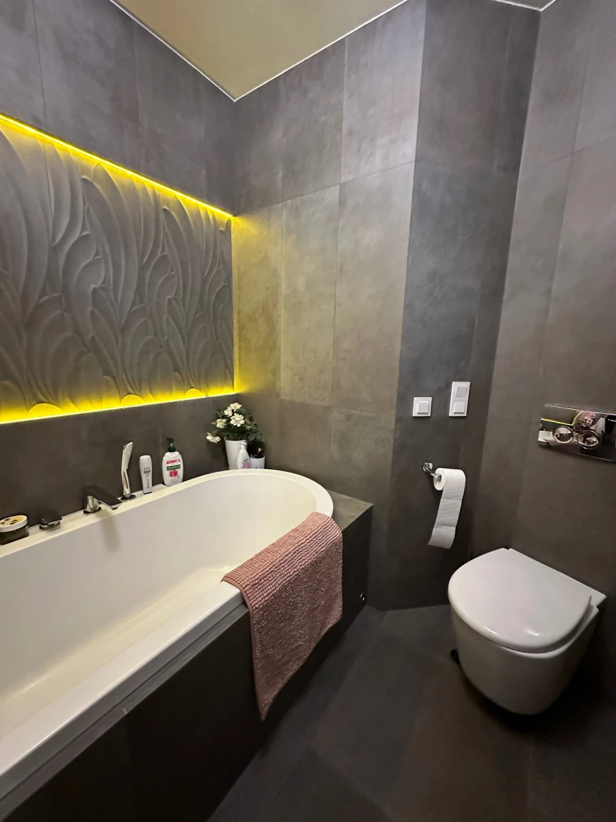 - Łazienka z wanną, prysznicem, pralką oraz WC.