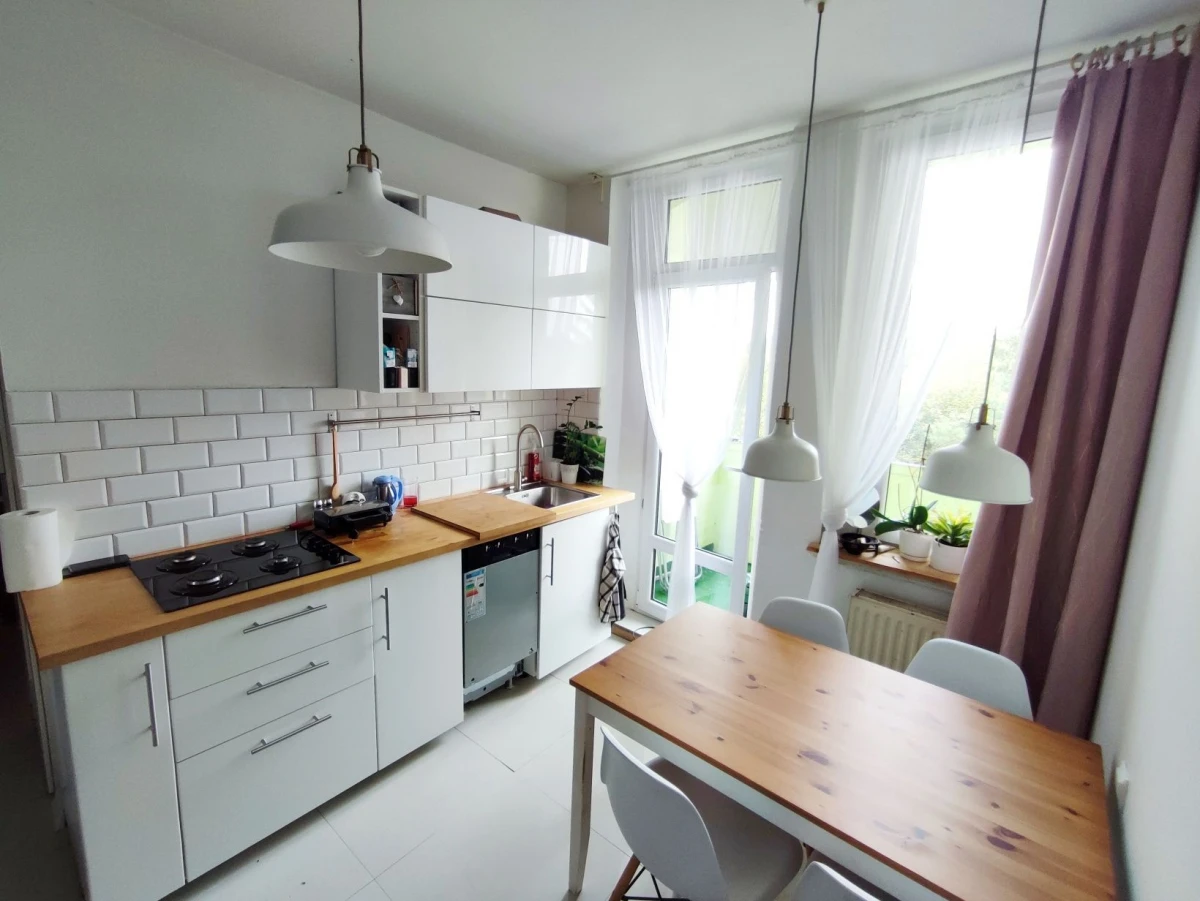 Na wyposażeniu mieszkania zostaje kuchnia z Ikei wraz z płytą gazową oraz meble w przedpokoju.