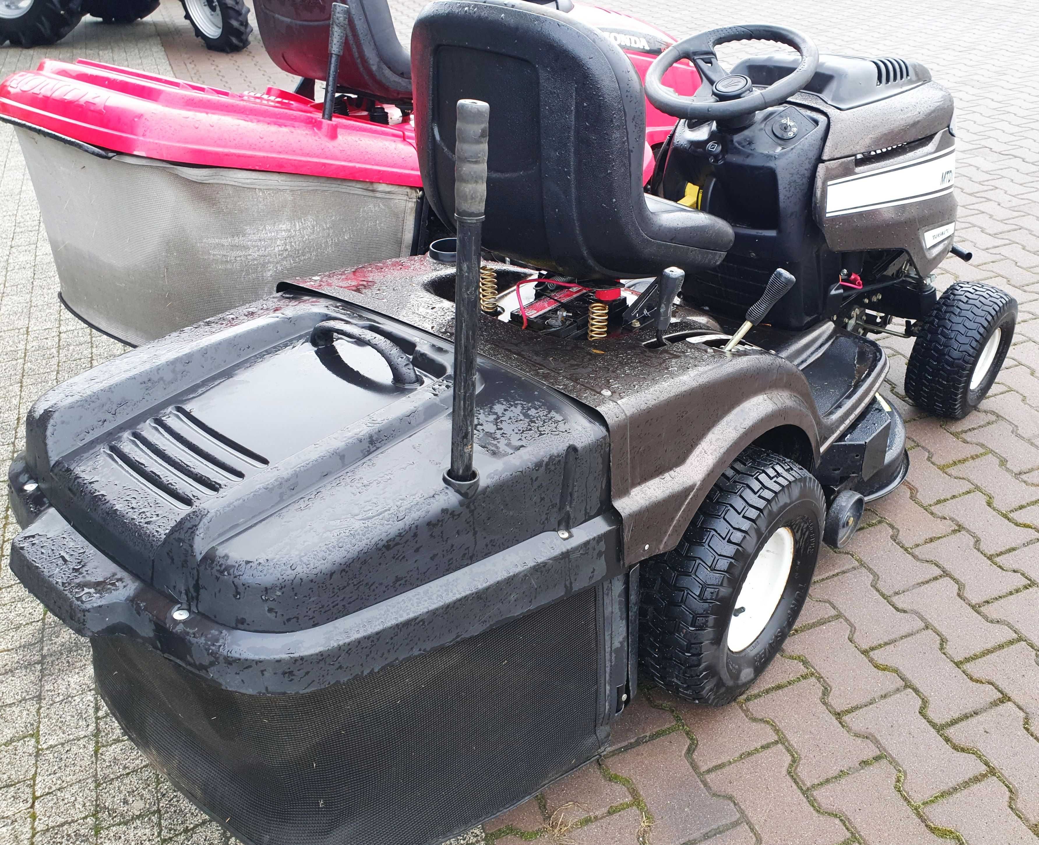 Używany traktor w bardzo dobrym stanie technicznym i wizualnym, wyposażony w 18,5 konny silnik Briggs & Stratton z pompą oleju i filtrem oleju, dzięki czemu może pokonywać duże pochyłości i wzniesienia. Traktor z mechaniczną skrzynią biegów z rewersem (6 biegów do przodu i do tyłu). Agregat koszący o szerokości 92 cm z dwoma nowymi nożami. Noże posiadają duże łopaty i bardzo dobrze wrzucają trawę do kosza. Dodatkowo w agregat wbudowane są dysze do mycia wodą po koszeniu. Kosz o pojemności 240 litrów wysypujemy z pozycji siedzącej za pomocą wysuwanej dźwigni. Traktor posiada jeszcze zderzak przedni chroniący przed uderzeniami w przeszkody, światła, pojemnik na napój oraz regulowany fotel. Bardzo ładny kolor - brązowy metalik.