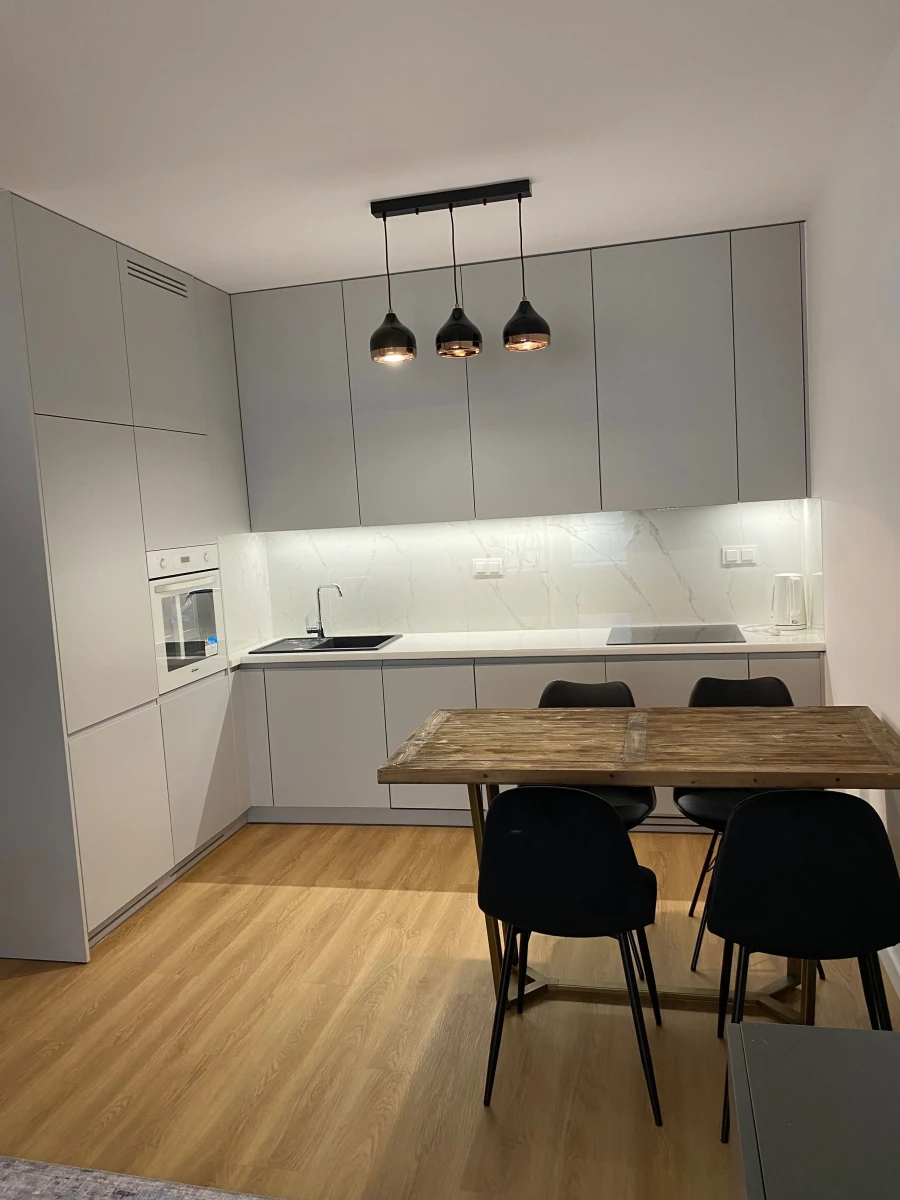 Wyposażenie mieszkania spełnia najwyższe standardy, zaczynając od kuchni, która została zaprojektowana na zamówienie i wyposażona w wysokiej jakości urządzenia, takie jak zmywarka, kuchenka indukcyjna, piekarnik oraz zabudowana lodówka. W salonie znajduje się rozkładana sofa, komoda oraz stolik kawowy, tworząc idealną przestrzeń do wypoczynku i spotkań z przyjaciółmi. Marmurowa łazienka wyposażona w pralkę dodaje elegancji i komfortu codziennym rytuałom pielęgnacyjnym. W sypialni znajduje się wygodne łóżko małżeńskie oraz duża szafa, zapewniając odpowiednią przestrzeń do przechowywania ubrań i innych rzeczy.