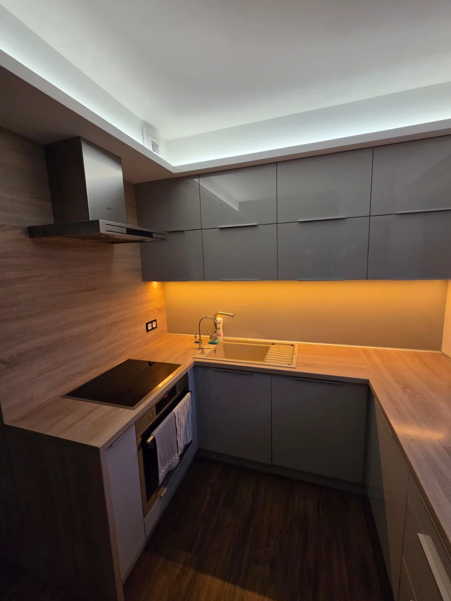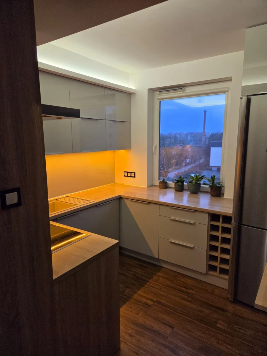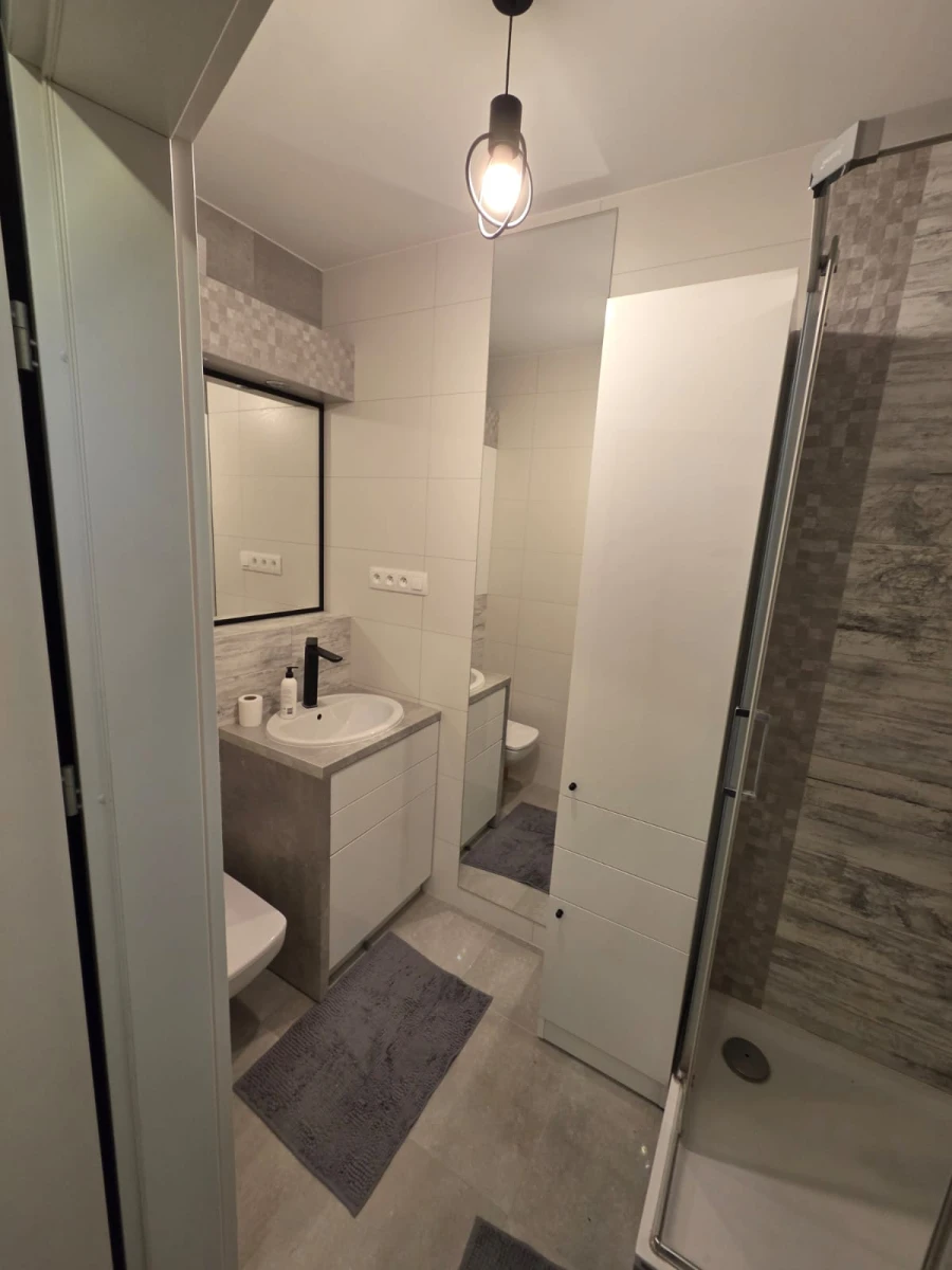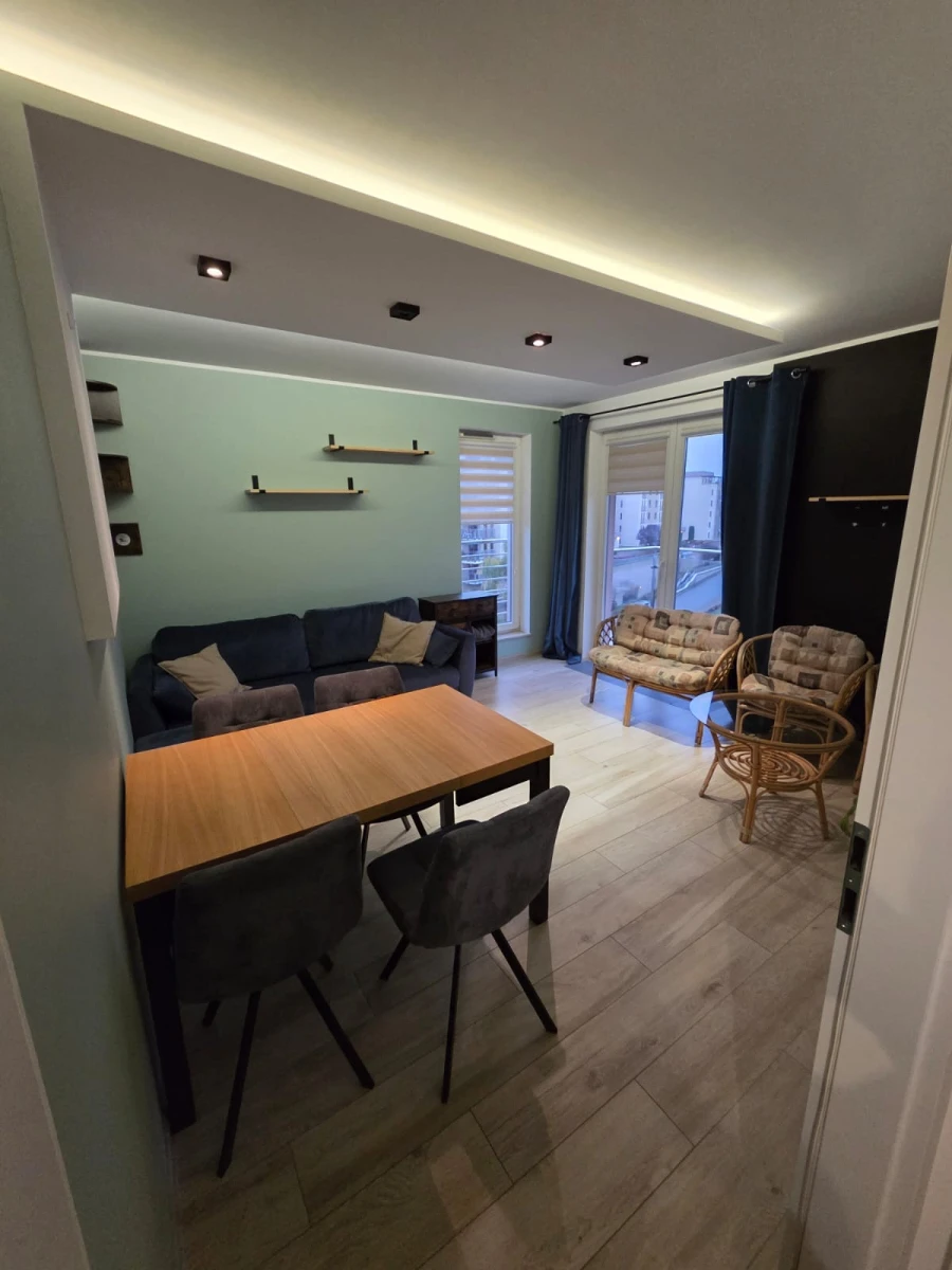 Mieszkanie 43 m² 2-pokojowe na 6 piętrze z oddzielną kuchnią wykończony w wysokim standardzie. Kuchnia wyposażona w piekarnik, płytę indukcyjną, filtry do wody pitnej, zmywarkę 60 cm, dużą lodówkę. Salon z dużym tarasem wyposażony w ogrzewanie podłogowe, bardzo wygodną kanapę oraz solidny drewniany stół. Sypialnia z zabudową stolarską oraz materacem 160 cm. Łazienka z prysznicem, pralką oraz miejscem na przechowywanie. Szafa zapewniająca miejsce do przechowywania w przedpokoju.